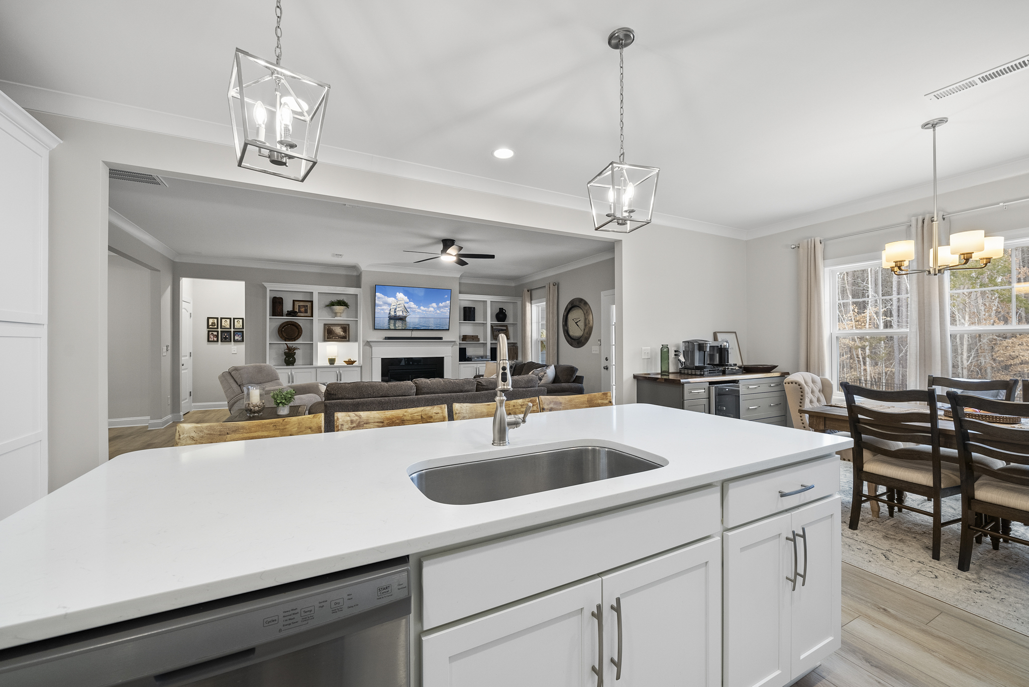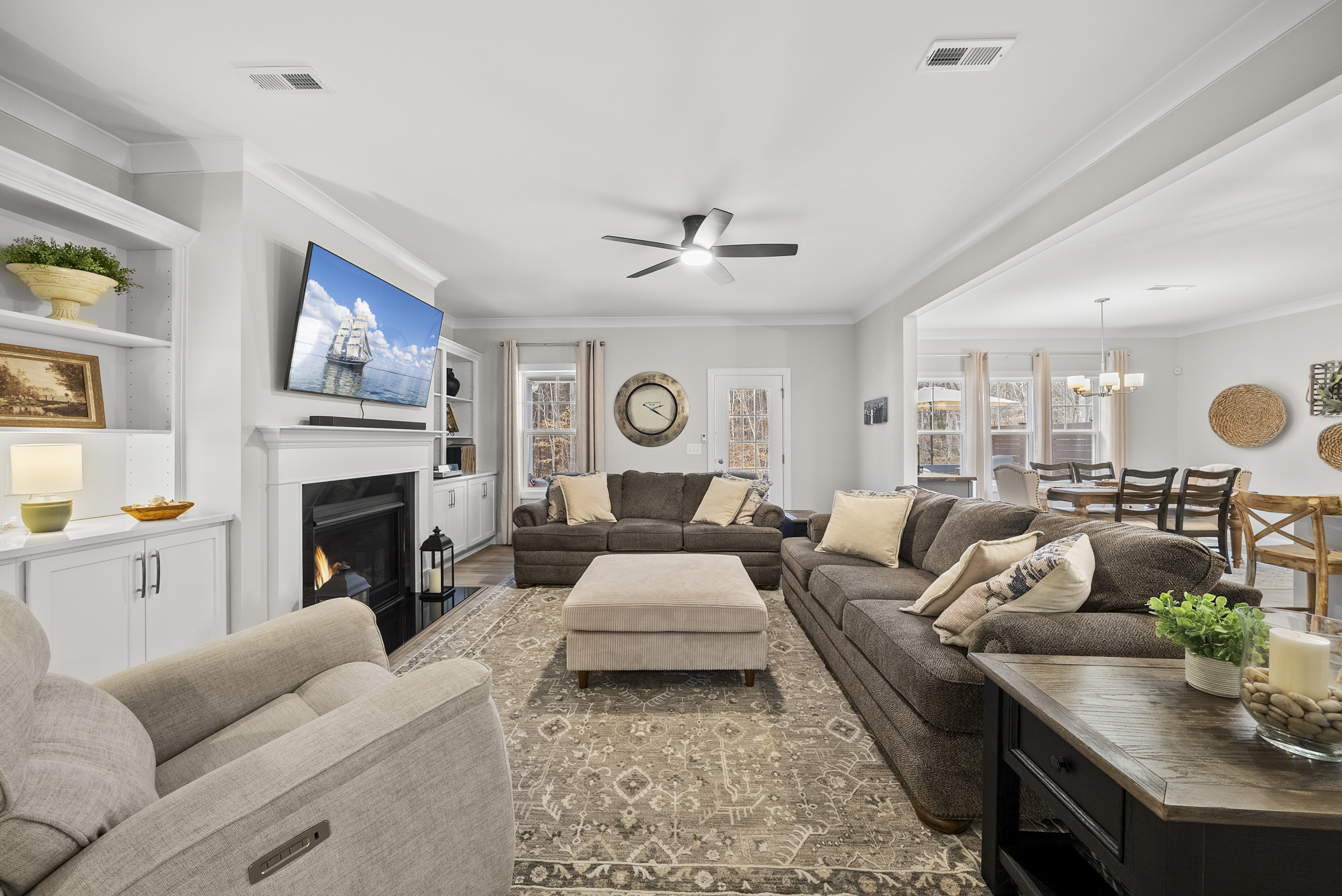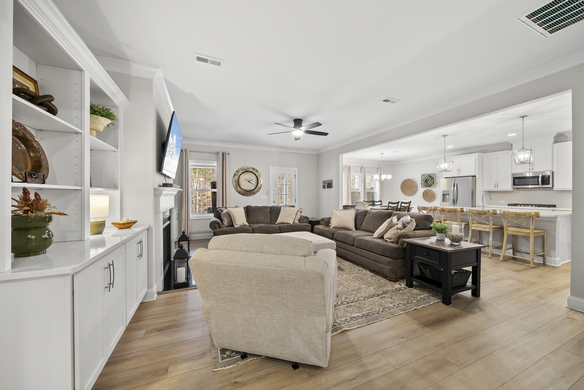 The light-filled great room centers around a gas-log fireplace with built-ins and flows seamlessly into the gourmet kitchen with quartz countertops, center island with seating, pantry cabinet, and stainless appliances—perfect for entertaining or everyday living.