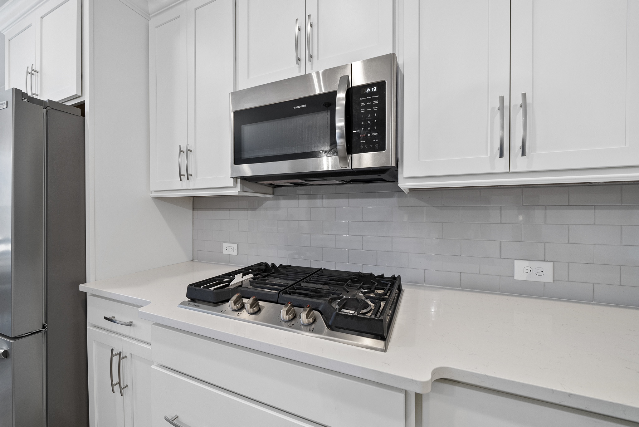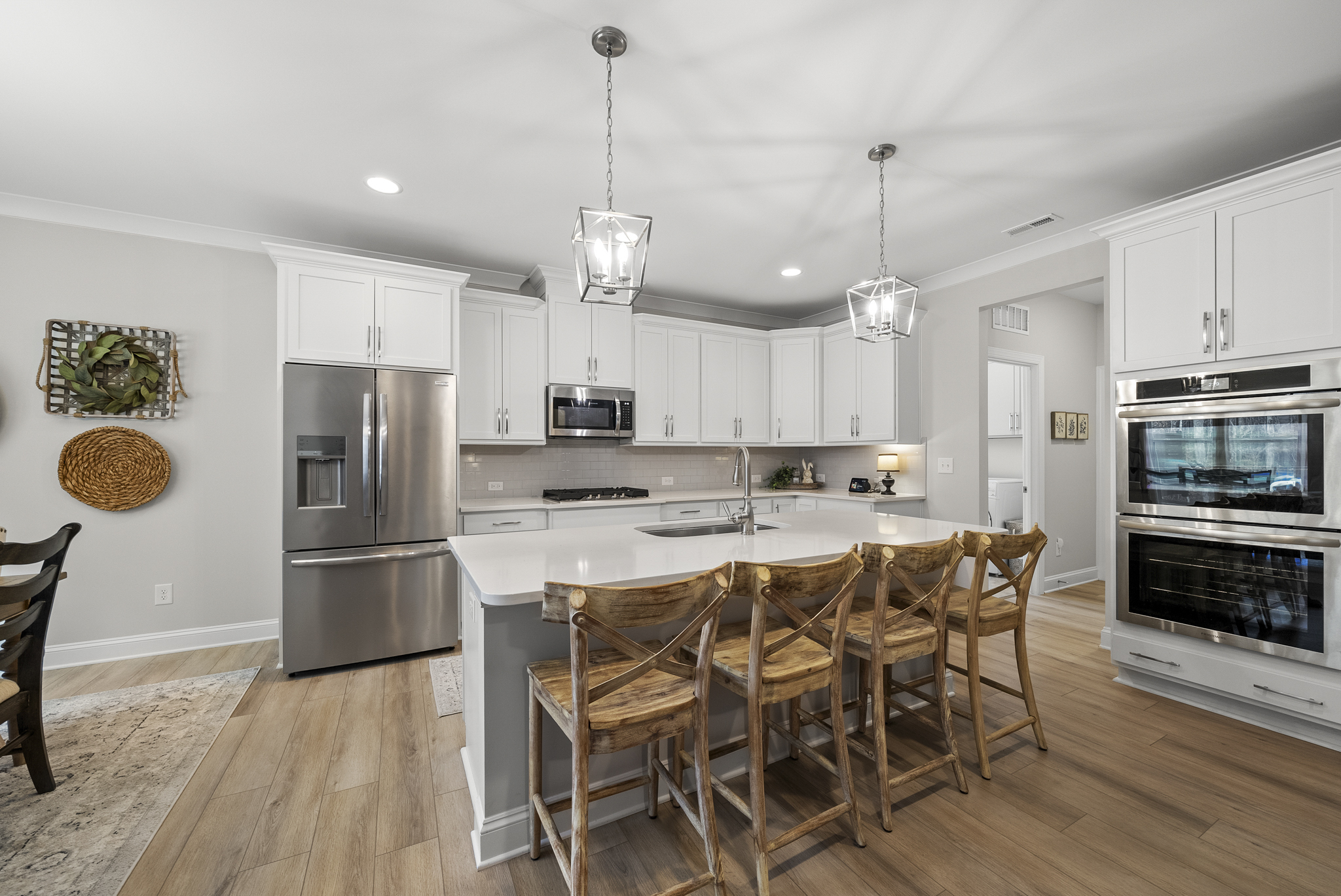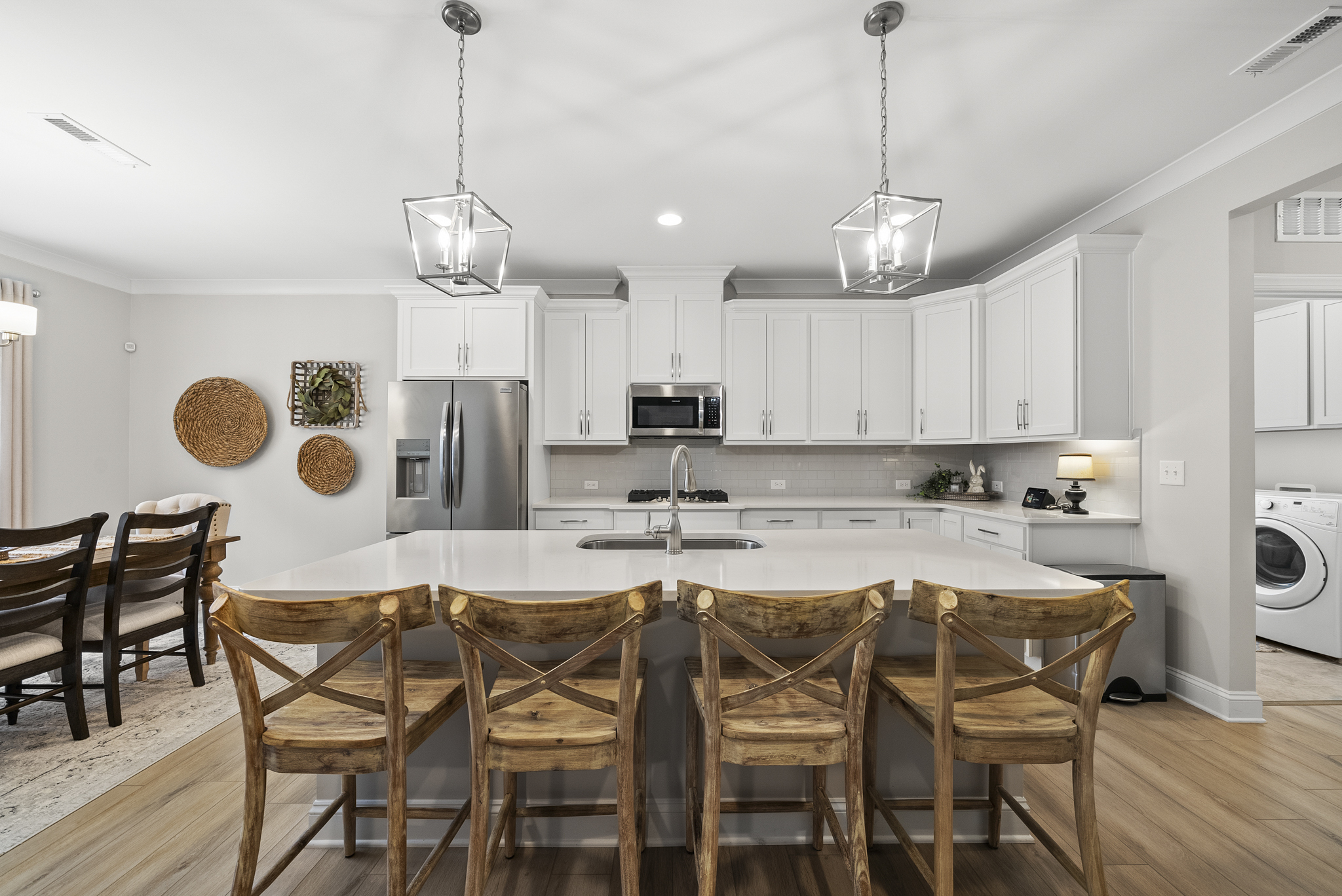 The light-filled great room centers around a gas-log fireplace with built-ins and flows seamlessly into the gourmet kitchen with quartz countertops, center island with seating, pantry cabinet, and stainless appliances—perfect for entertaining or everyday living.