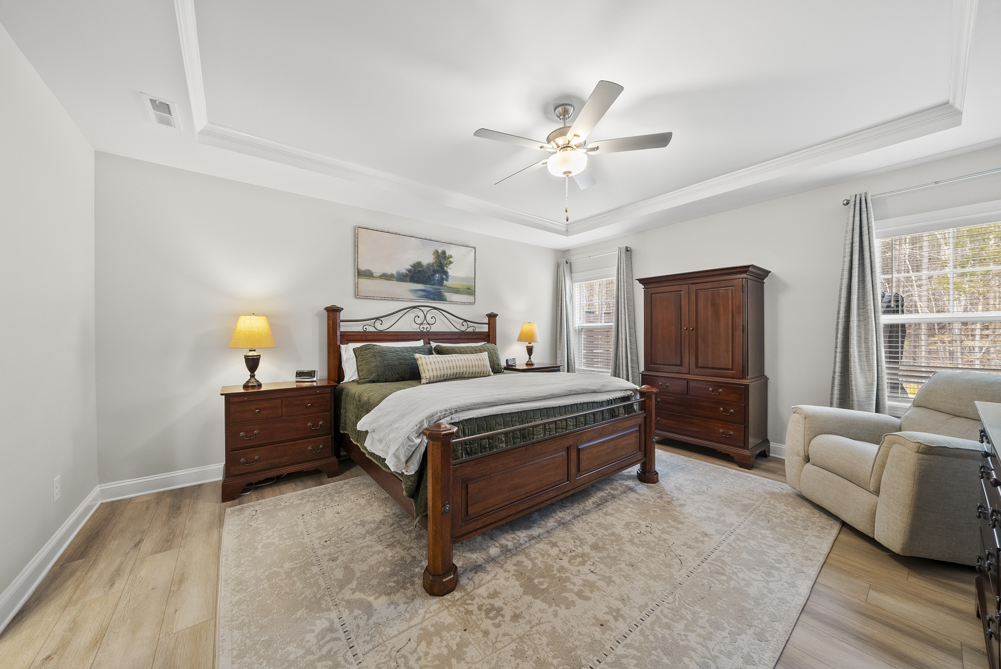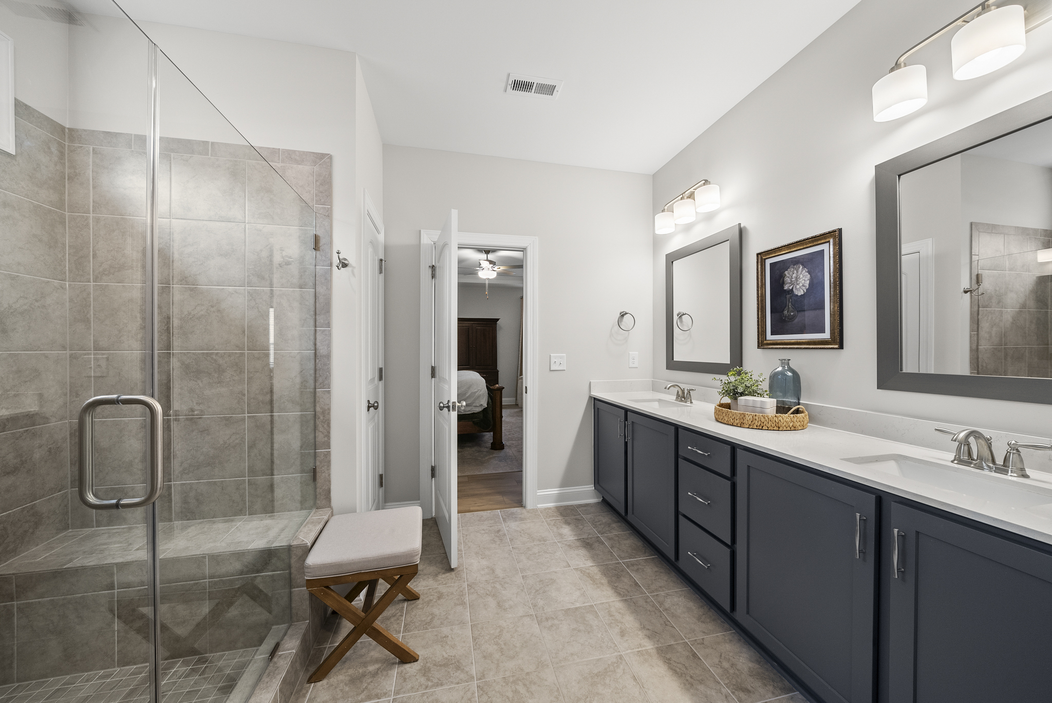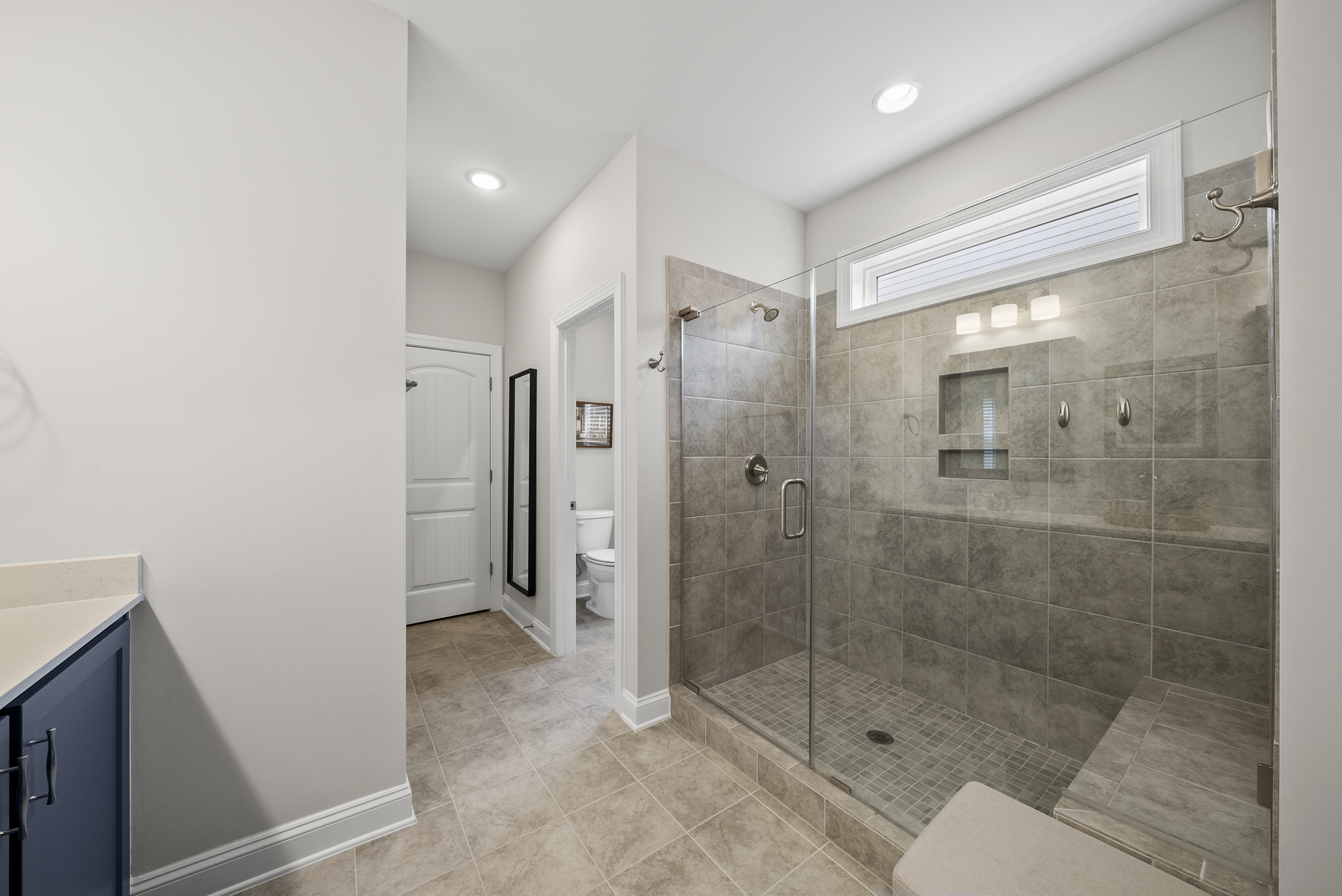 The first-floor primary suite offers a private retreat with spacious walk-in closet, and spa-inspired bath featuring an oversized tiled shower, and private water closet.